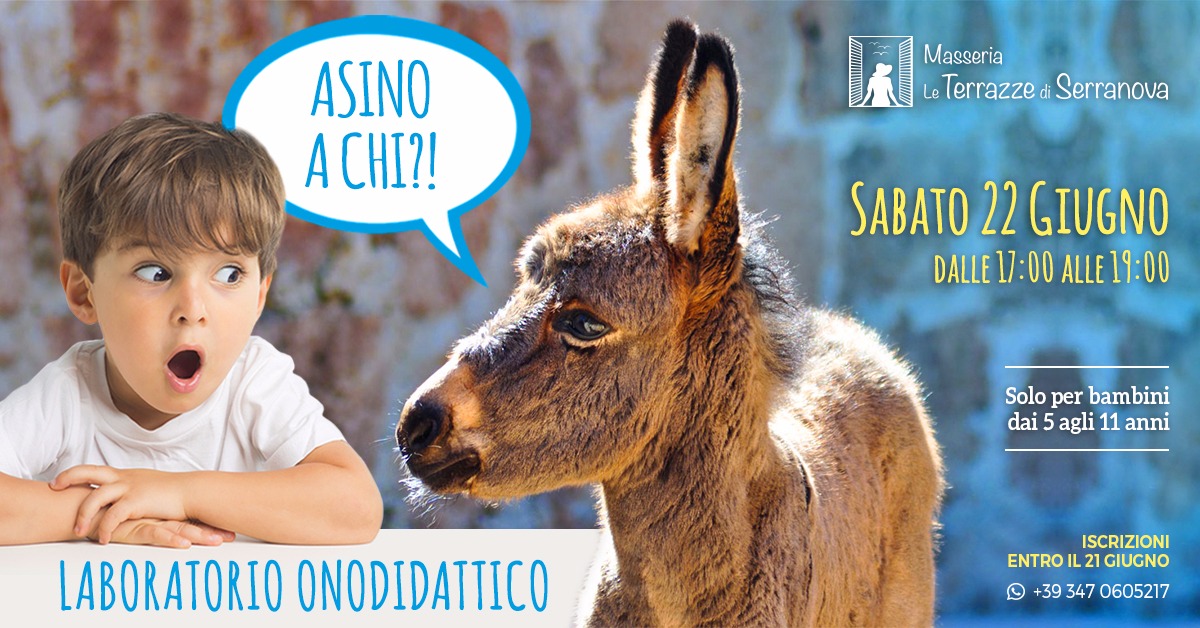 Sabato 22 giugno alle Masseria Le Terrazze di Serranova , un IOOOOOOO di gioia accoglierà i più piccoli, all’incontro “ASINO A CHI ?” il Laboratorio onodidattico dedicato ai bambini, pronti a fotografare meraviglia e dolcezza, a sentire il vento nelle orecchie lunghe e pelose degli asinelli.
